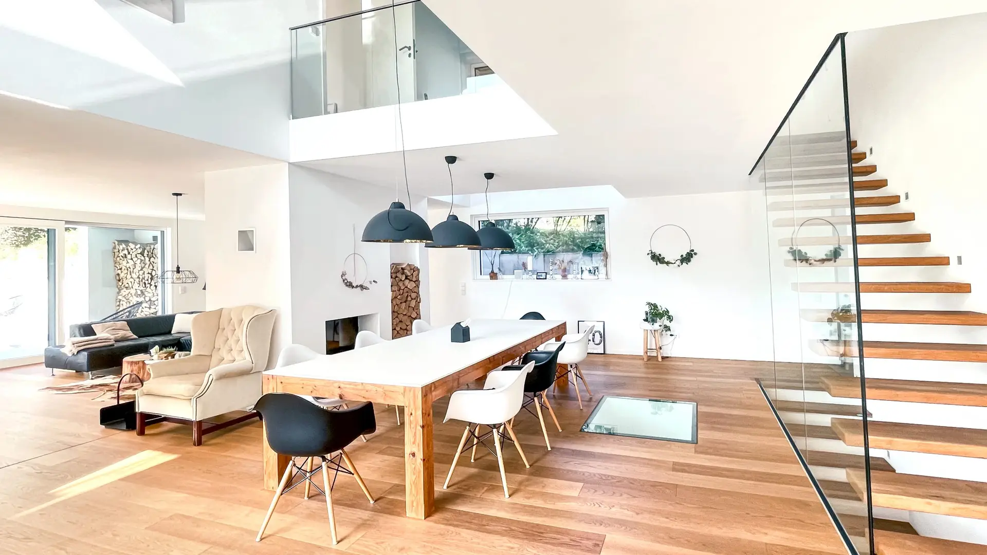 Fließender Wohnraumübergang -Ihre Treppe führt ein Stiefkinddasein? Vielleicht ist es Zeit, dies zu ändern: Wir glauben an die Treppe – als Teil von Wohnkultur, der es verdient, mit Sorgfalt gewählt zu werden. Und unterstützen Sie bei Ihrer Entscheidung. Ansprechende Treppen aus Massivholz lassen Sie nicht nur bequem das Stockwerk wechseln, sondern realisieren fließende Wohnraumübergange ohne Stilbruch. Treppen, Holzböden und Parkett sind Teil des Wohnbereichs: Binden Sie sie harmonisch ein, z. B. indem sich Hölzer und Materialien von Wohnzimmer, Flur oder Schlafbereich mit Aufgang, Treppengeländer und Treppenunterbau fortsetzen. In Farbwahl und Material – homogen licht oder prägnant gemasert, in Wunschtechnik verlegt.